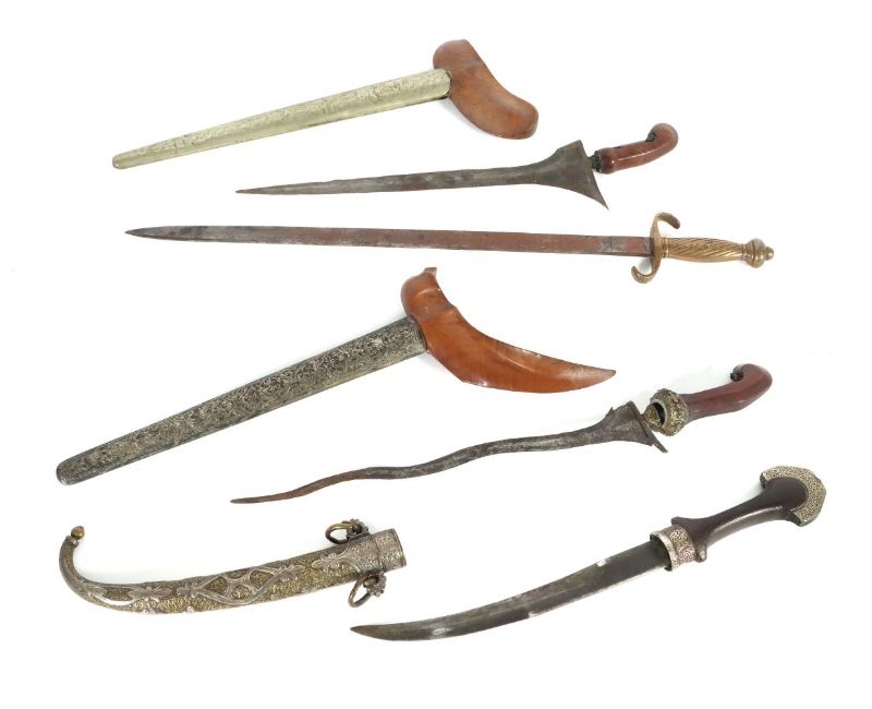 20. Jh., 1x marokkanischer Koumya/Krummdolch mit reich verzierter Metallscheide, 2x indonesische Kris mit gerader und mit geflammter Klinge, Scheiden aus Blech mit floralem Dekor und mit Holzmundstück, 1x Seitengewehr wohl 19. Jh. mit Messinggefäß und s-förmigem Parierstück, L: bis 61 cm. Oxydationsspuren, mit Besch., tlw. lose Teile.
