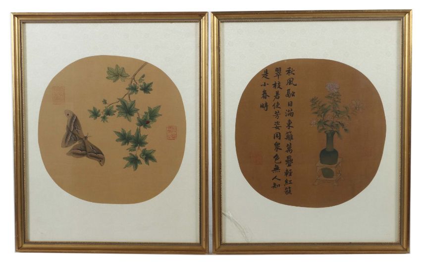 China, 2 verschiedene Tuschmalereien mit Pflanzen und Schmetterling, 1x mit Gedicht, je Signaturstempel, Tusche/Seide, HxB: ca. 30/30 cm. Altersspuren, 1x Glas gesprungen. Je hinter Glas gerahmt.