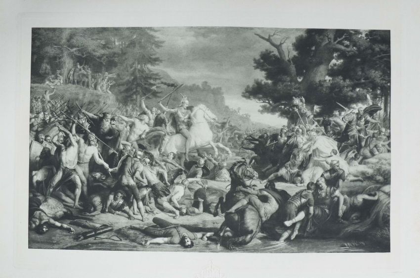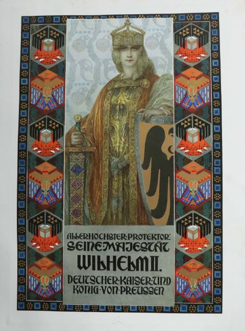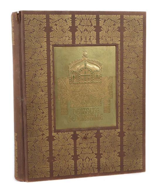 Deutsche Gedenkhalle - Bilder aus der Vaterlaendischen Geschichte, Leipzig, Brockhaus, Herzig, Max Deutsche Gedenkhalle - Bilder aus der Vaterlaendischen Geschichte, Leipzig, Brockhaus, o.J., um 1904, Schriftleitung: Prof. Dr. Julius v. Pflugk-Harttung, Leitung des illustrativen Teiles: Prof. Dr. Hugo Tschudi, mit zahlr. Kunstblättern, prächtiger Leinenband über Holzdeckeln mit goldfarbener, eingelassener Deckelillustr. (Kaiserkrone), Kopfgoldschnitt, zweiseitiger Rotschnitt, Großfolio. Stärkere Altersspuren, part. besch./fleckig.