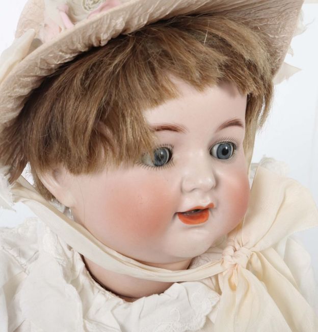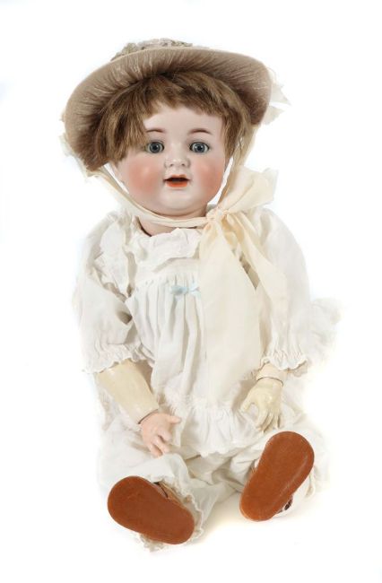 Kopfmarkemarke: Simon & Halbig 126 50, Porzellankurbelkopf, blaue Schlafaugen, offener Mund m. 2 Zähnen und Zunge, org. Perücke, Gliederkörper m. Kugelgelenken ergänzt , weißes Kleid m. Unterkleidung, Hut und Lederschuhe, H: 58 cm, part. Altersspuren, am Kragenrand leichter Schaden, Lackverlust, 1 kl. Finger fehlt.