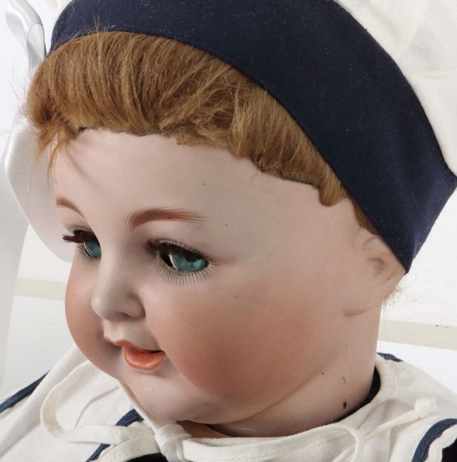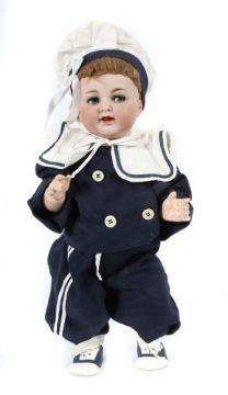 Simon & Halbig, Nr. 126, Porzellankurbelkopf, blaue Schelmenaugen, offener Mund m. 2 Zähnen und Zunge, fixierte Perücke ergänzt, Baby-Sitzkörper, Matrosenazug und Schuhe ergänzt, H: 50 cm, leichte Altersspuren, 1 kl. Finger fehlt.