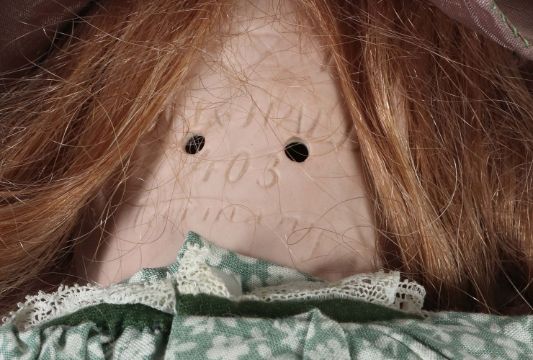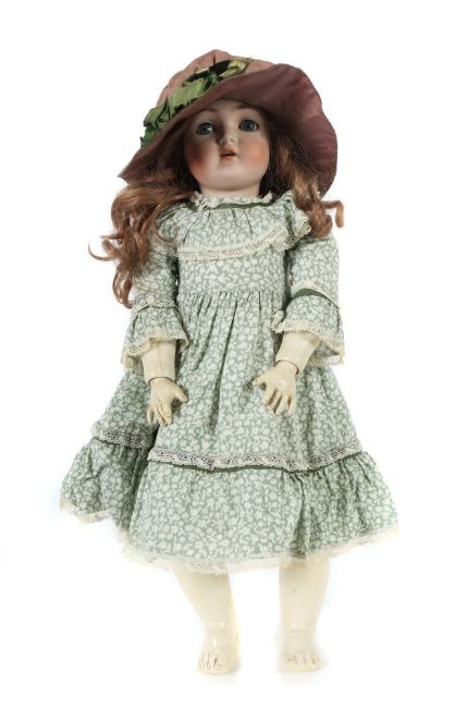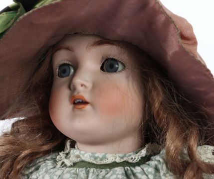 Halsmarke: K*R Simon & Halbig 403 Germany; um 1920, Porzellan-Kurbelkopf, blaue Schlafaugen, offener Mund mit 4 Zähnchen oben, org. Perücke, sehr heller Gliederkörper m. Konturen, altes Kleid m. Unterkleid, H: 53 cm, Altersspuren ohne Schäden.