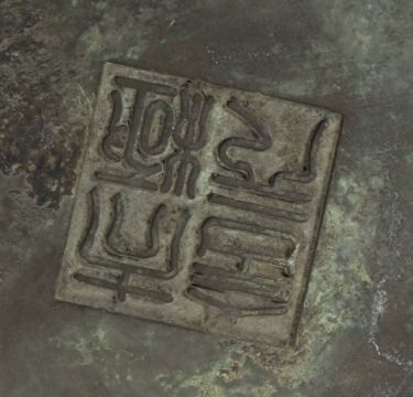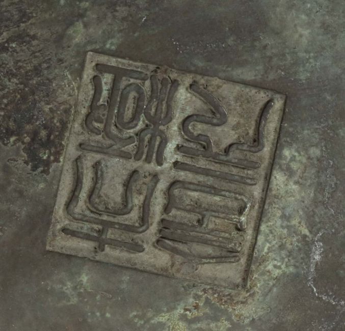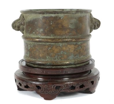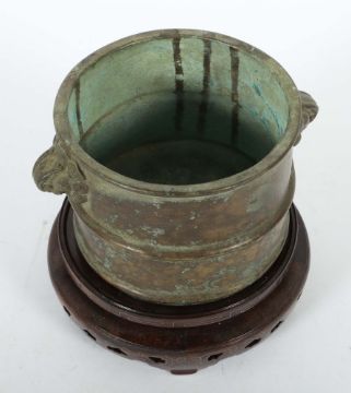 China, wohl 18./19. Jh., ca. 1658g, auf Hartholzsockel, Zylinderform mit Rillendekor, seitlich zwei Handhaben mit Köpfen eines Fo-Hundes, Boden mit Stempelmarke, HxD: Topf ca. 10,5/18 cm. Provenienz: Bayerische Privatsammlung.