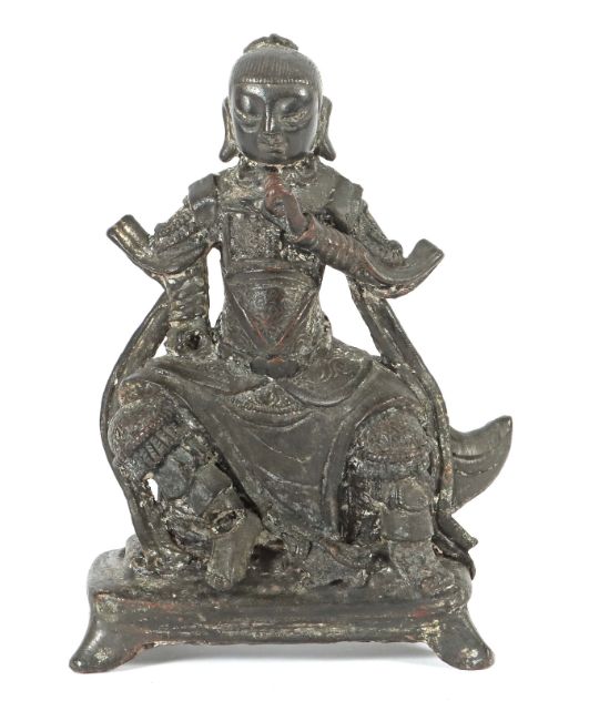 China, 16./17. Jh., Bronze, detailreiche Kleidung, auf einem Podest in einer seitwärts gewandten Haltung sitzend, H: ca. 19,5 cm. Altersspuren, das rechte Fußgelenk angebrochen, Attribut fehlt. Provenienz: Privatsammlung Baden-Württemberg, vor 1977 erworben.