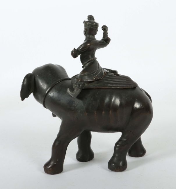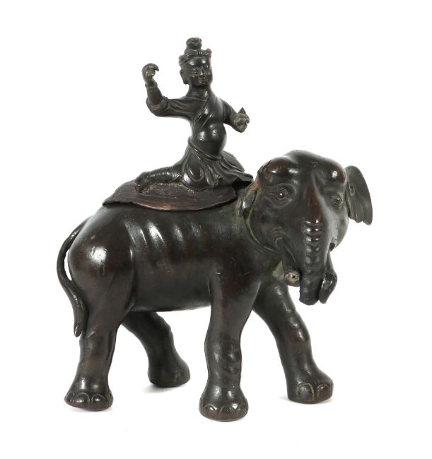 China, 18./19. Jh., Kupferbronze, Hotai als Elefantenreiter, Hohlkörper als Brennkammer, der Reiter als Deckelfigur auf einem Tuch sitzend, auf dem Rücken eine Lochbohrung, HxL. Ca. 30,5/29 cm. Linker Arm des Hotai fehlt, ein Stoßzahn angebrochen, der andere Stoßzahn abgebrochen und lose anbei, Deckelunterseite mit alten Reparaturstellen. Provenienz: Privatsammlung Baden-Württemberg, vor 1977 erworben.