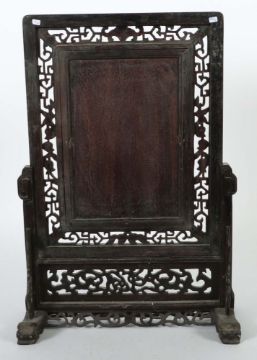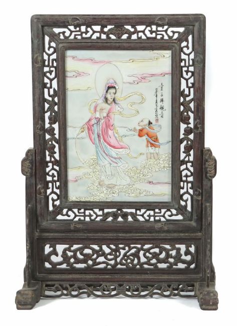 China, 1. Hälfte 20. Jh., Porzellan, polycrhrome Aufglasurbemalung mit Guanyin, welche ein Kind anbetet, rechts davon Kalligrafie mit roter Signaturmarke, im beschnitzten Holzrahmen auf Gestell, HxB: ca. 67/46 cm. Provenienz: Bayerische Privatsammlung.