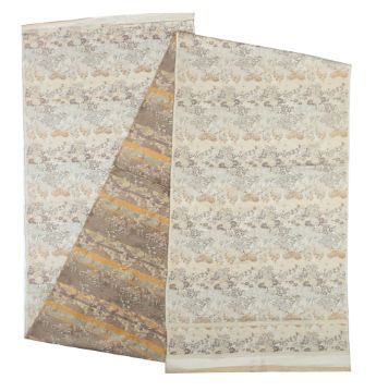 wohl China, 20. Jh., aus 2 Bahnen zusammengenähtes Jacquard-Seidengewebe mit Musterrapport aus Blüten und Baummotiven zusammengestellt in Friesen, LxB: 393/68 cm.