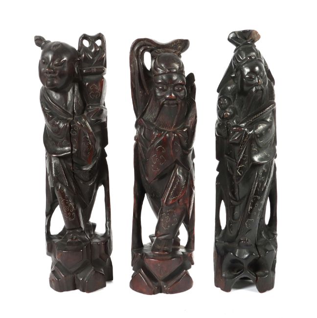 China, 1. Hälfte 20. Jh., Hartholz, geschnitzt, eingesetzte Glasaugen, Dekoration mit Messingfadenintarsie, H: bis ca. 35,5 cm. Part. kleine Fehlstellen. Provenienz: Privatsammlung Baden Württemberg, vor 1977 erworben.