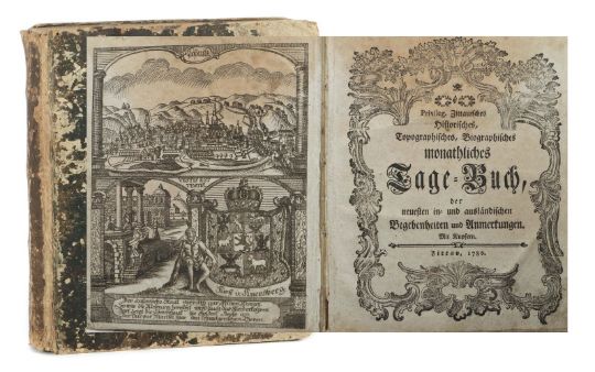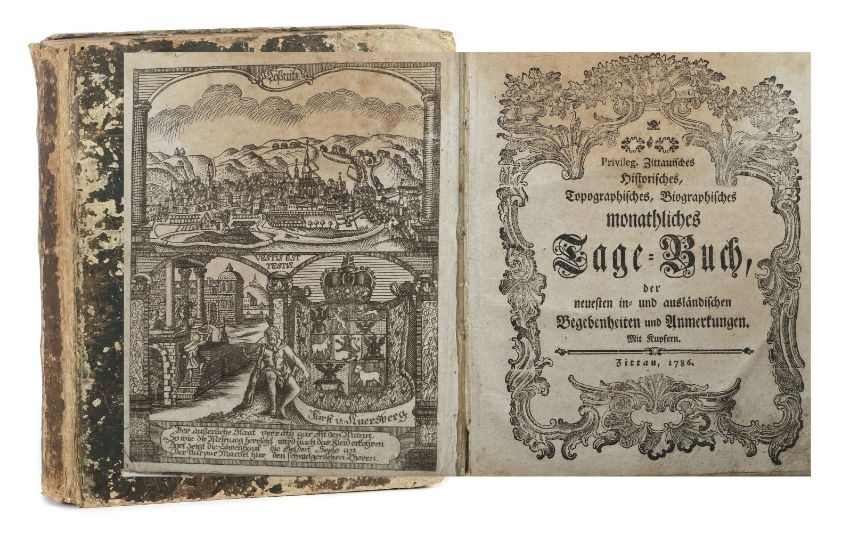 Historisches, Topographisches, Biographisches monathliches Tage-Buch, der neuesten in- und ausländischen Begebenheiten und Anmerkungen, Zittau, 1786/87, 2 Jahrgänge in einem Bd., 24 Frontispize, Pappeinband, Oktav. Stärkere Altersspuren, part. besch./fleckig, Paginierungsfehler.