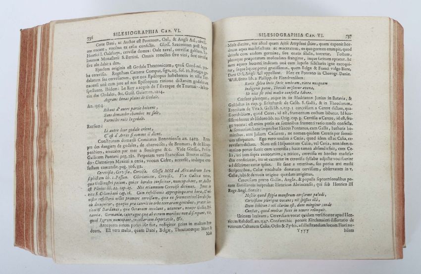Silesiographia renovata, Breslau und Leipzig, Bauch, 1704, 804+768+1.283 S. + Index, 3 Teile in einem Band, mit einem gestochenen Portait-Frontispiz, umgehend gesprenkelter Schnitt, Pergamenteinband mit hangeschriebebem Rückentitel, Oktav. Altersspuren, part. fleckig, Paginierungsfehler. Historisch-topographische Beschreibung Schlesiens.