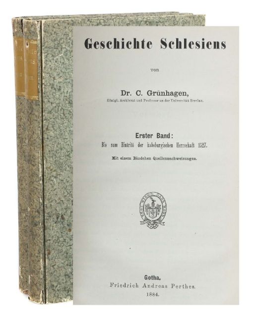 Geschichte Schlesiens, Gotha, Perthes, 1884/86, 433+115+446+46 S., 2 Bde. mit Quellennachweisungen, umgehend gesprenkelter Schnitt, Pappband mit goldgeprägtem Rückentitel, Oktav. Altersspuren, part. besch..