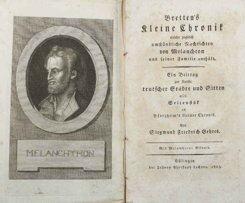 Bretten's kleine Chronik wlche zugleich umständliche Nachrichten von Melanchton und seiner Familie erzählt, Esslingen, Lochner, 1805, 311 S., mit gestochenem Portrait-Frontispiz und einer gefalteten Tabelle, Broschur, Oktav. Stärkere Altersspuren, part, besch./fleckig, Seiten tls. unaufgeschnitten, jüngerer Rückentitel.