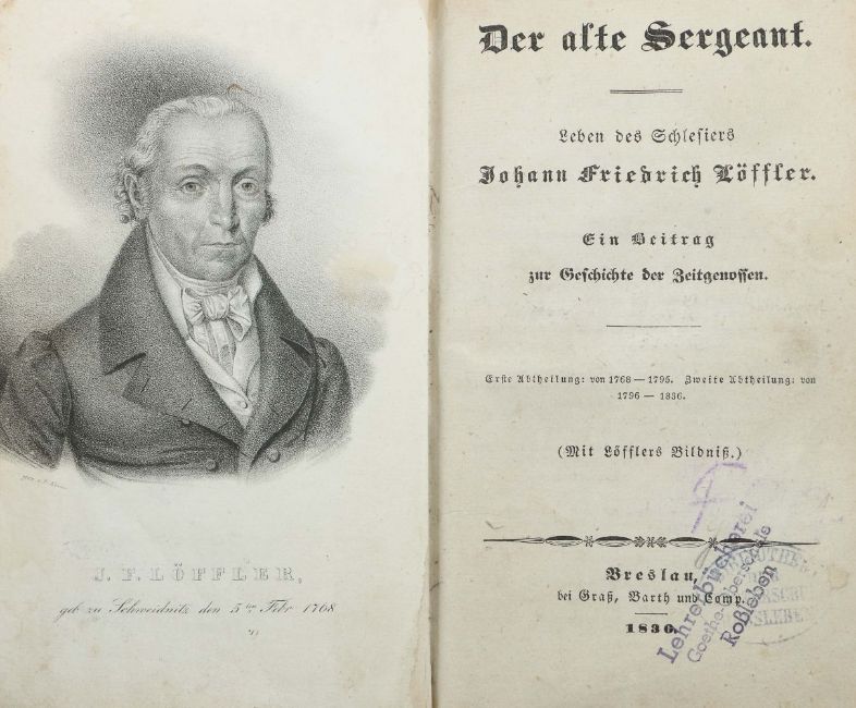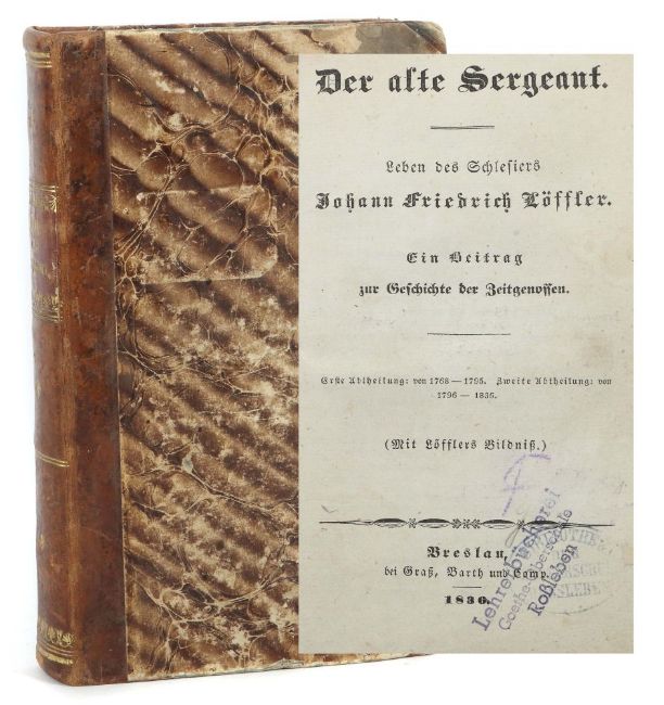 Leben des Schlesiers Johann Friedrich Löffler - Ein Beitrag zur Geschichte der Zeitgenossen, Breslau, Grass, Barth und Comp., 1836, 483 S., Portrait-Frontispiz, umgehender Farbschnitt, goldgeprägter Halbledereinband, Oktav. Stärkere Altersspuren, part. besch./fleckig, Stempel, vereinzelt handschriftliche Eintragungen.