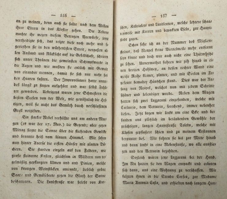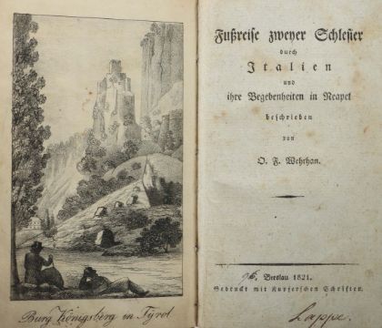 Fußreise zweyer Schlesier durch Italien und ihre Begebenheiten in Neapel, Breslau, Kupfer, 1821, 336 S., Halbledereinband mit goldgeprägtem Rückenschildchen, Klein Oktav. Stärkere Altersspuren, part. besch./fleckig, Paginierungsfehler, Vorsatz mit handschriftlichen Eintragungen.