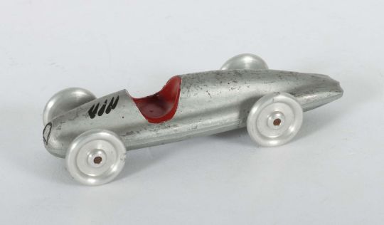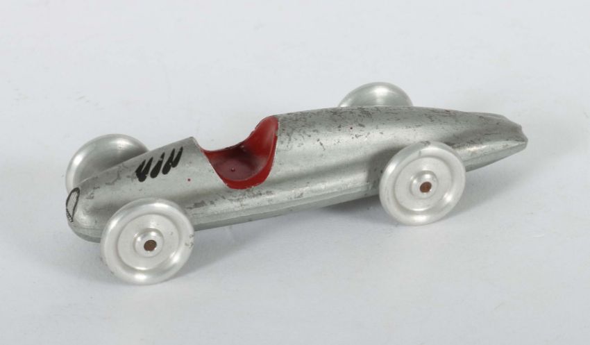 In der Art eines "Silberpfeils", ca. Mitte 20. Jhd., Aluminium-Spritzguss, rund geformte Sitzfläche, rot lackiert, Aluminiumräder, L: 11,5 cm. Leichte Altersspuren.