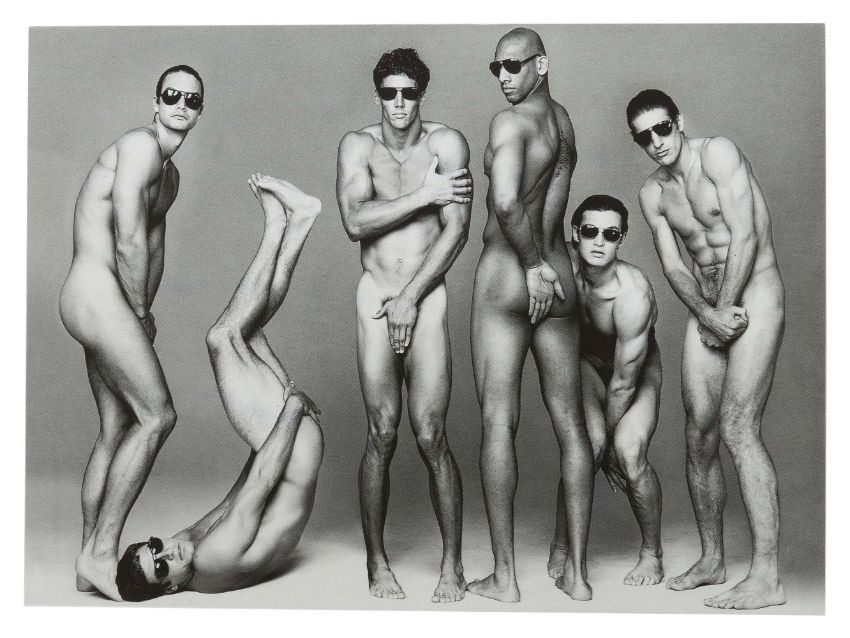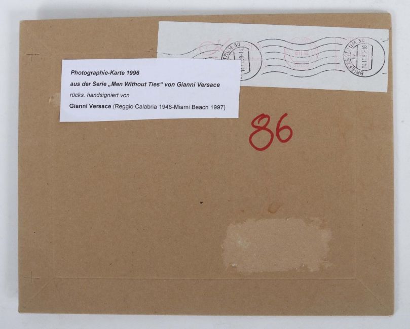 aus der Serie "Men Without Ties" von Gianni Versace, 1996, rückseitig vom Modesdesigner handsigniert, HxB: ca. 12/16,4 cm. Sehr guter Erhaltungszustand.