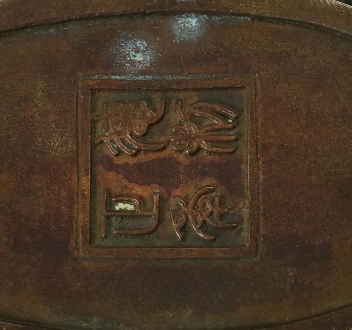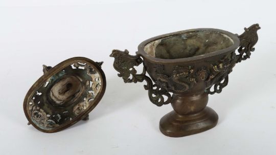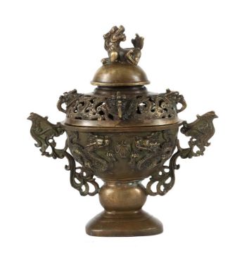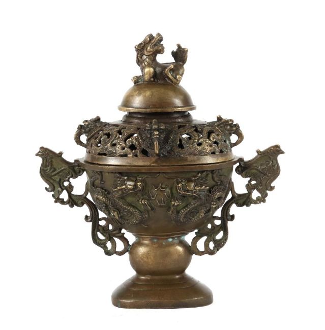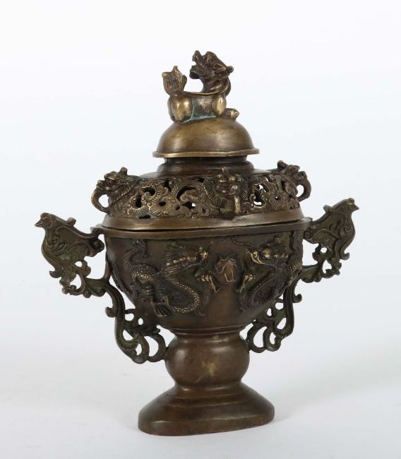 China, 20. Jh., Bronze, ovaler Korpus, vorder- und rückseitg mit plastischen Darstellungen je zweier Drachen einen Feurball jagend, seitlich druchbrochene Handhaben in Form von Phönixen mit Volutenzier, Deckel mit durchbrochenem Dekor und plastischen Fabelwesen, bekrönt von einem Tempeldrachen als Handhabe, bodenseitig Prägemarke, H: ca. 22 cm.