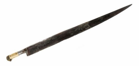 Afghanistan, 19. Jh., lange im Querschnitt T-förmige Rückenklinge, das Heft mit Griffschalen aus Bein und vogelkopfförmigen Knaufschalen aus Horn, L: 59/72 cm. Narbig, Scharten, Knauf mit antiker Rep.