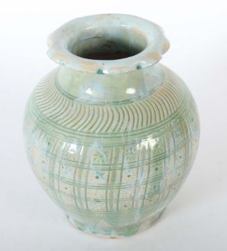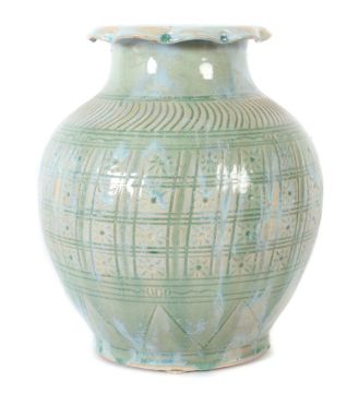 wohl China, 20. Jh., heller Scherben mit craquelierter Glasur in Seladon, Rot und Blau, mit umlaufendem, archaischem Dekor, umgeworfener Mündungsrand mit kugelförmigen Einbuchtungen und teils tropfenförmigen Abschlüssen, H: 34 cm. Leicht ber. und best. Provenienz: Aus einem süddeutschen Sammlernachlass mit jahrelangem Wohnsitz in Hongkong und Japan.