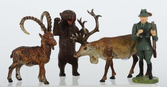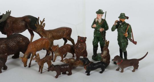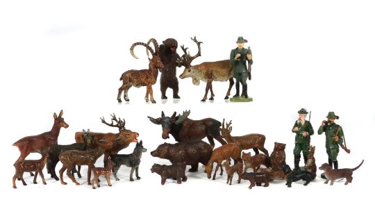Elastolin, Lineol, Tipple Topple u.a.; meist 1. Hälfte - Mitte 20. Jhd., Masse, fein bemalt; 3 x variierende Jägerfigur m. Gewehr (2 x m. bewegl. Arm), H: 11 cm; 2 x unterschiedl. Dackel, L: 6 cm und 8 cm; 1 x Schäferhund, L: 8 cm; 1 Fuchs, L:9 cm, 2 x Hasen, sitzend und im Lauf; H/L: 6 cm und 7,5 cm; 1 x Braunbär stehend, H: 11 cm, 1 x Braunbär L: 11 cm; 3 x kl. variierende Braunbären stehend, H: 5 cm, laufend, L: 5 cm und 4 cm; 1 x Elch (Horn geklebt, Farbverlust), L: 13 cm; 1 x röhrender Hirsch, L:13 cm; 1 x Rentier, L: 12 cm; 4 x variierende Rehe, L: 9/8/7/6 cm; 2 x Bambi, L: 4 cm; 1 x Rehbock, L: 9 cm; 1 x Steinbock, L: 8 cm, 1 x Gämse, L: 9 cm. Überwiegend gute, altersbedingte Zustände, part. Altersspuren, teils m. min. Rissbildung, part. Restaurierungen/Klebespuren, part. Lackverlust.