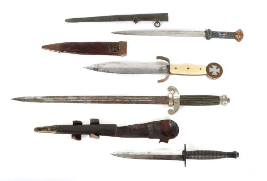 1. Hälfte 20. Jh., 1x Seitengewehr Klingenlänge 38 cm mit beidseitig doppelter Kehlung und gemarkt W.K & C (= Weyersberg, Kirschbaum & Cie. Solingen), 1x Dolch Klingenlänge 25 cm mit Cloisonné-verziertem Griff + Messingscheide mit Dekorgravur und rücks. gemarkt u.a. London, 1x Dolch Klingenlänge 21,5 cm mit Griffschalen aus Bein und auf dem scheibenförmigen Griffknauf gepunzt "1941/RUSSLAND/194" + Lederscheide, 1x Dolch Klingenlänge 16,5 cm mit geriffeltem Messingheft + Lederscheide. Starke Gebrauchs- und Altersspuren, mit Oxydation, Klingen teils fleckig, Cloisonné und Scheiden teils besch.