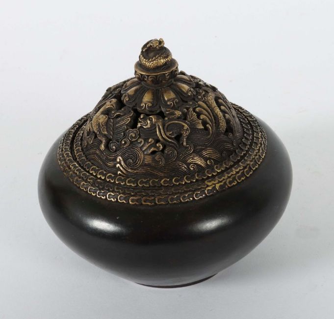 China, 20. Jh., Bronze/teilweise vergoldet, bauchiges Gefäß, mit Fabeltieren auf dem durchbrochenen Deckel, bodenseitig Prägemarke, HxD: ca. 12/13 cm.