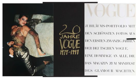 Jubiläums-Portfolio mit den schönsten Fotos aus den ersten zwanzig Jahren der deutschen Vogue - Eine Hommage an alle die das Magazin zum Manifest des Glamour machten, München, Condé Nast, 1999, handnum. Exp. 1167/2000, mit 45 Fotografien u.a. von Newton, Mapplethorpe, Lindbergh, Tyen, Hiro, Elgort, Watson und Lagerfeld, die in diesen zwanzig Jahren in der deutschen Vogue veröffentlicht worden sind, in goldgeprägter Originalhalbleinenmappe, Großfolio. Leichte Altersspuren, Ecken min. best..