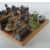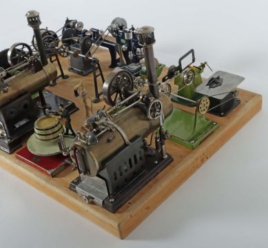 Auf Sockel montiert, 1 x Falk, liegende Dampfmaschine Modell 450, um 1900, LxB: 25,5/12,5 cm; 1 x Falk, liegende Dampfmaschine, Modell 458, um 1912, LxB: 21/11,5 cm; 1 x unbekannte liegende Dampfmaschine der 60/70er Jahre, LxB: 21/12,5 cm; 1 x E-Motor, Bakelitgehäuse, LxB: 9,5/9,5 cm; Märklin: 3 Antriebsmodelle: Schleifstein 4251; Kaltsäge 4300; Kreissäge m. klappbarer Tischplatte 4254/1; Farbenrad 4361, Transmission 4383/25; Doll: Böttcher Modell 644, selten; EKT: Drehbank m. Prismenbrett, Ständerbohrmaschine, Exzenterpresse; Bing: Schleif-und Poliermaschine mit beweglichem Tisch, selten; 2 weitere Transmissionen, 2 Lampen, Zubehör: 4 Kännchen in 2 Größen, 2 Trichter, 1 Ölkanne; Sockelbrett m. Vollholzkante, LxB: 73/52 cm. Normale Spielspuren, Brenner bei den Falks fehlend, durch moderne Eigenbau-Brenner aus Aluminium ersetzt.