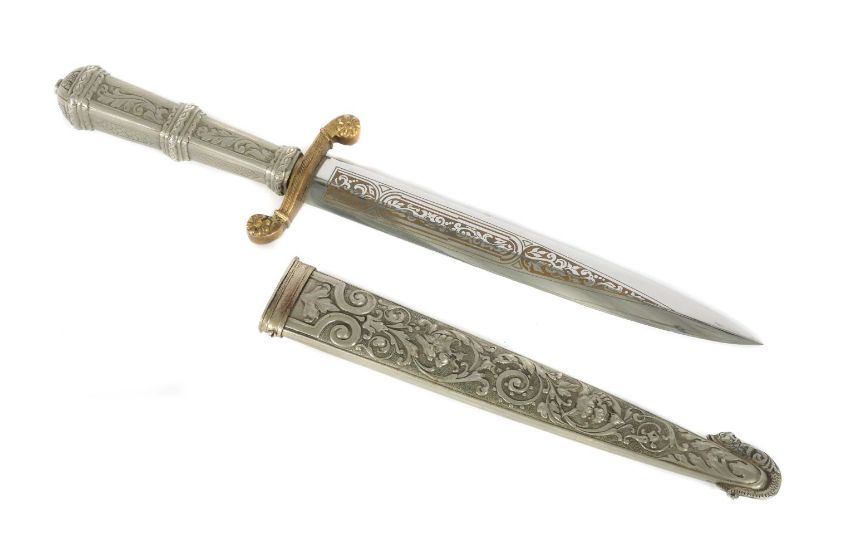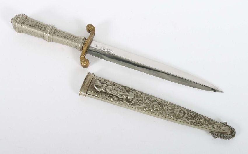 Solingen, 20. Jh., im Stil der Renaissance, Mittelgrat-Klinge terzseitig mit floralem Dekor, quartseitig gemarkt "di Medici" auf Spitzbogenfenster, Parierstange s-förmig mit Rosetten, Heft und Scheide aus Metall mit Reliefdekor aus Ranken- und Blattwerk, teilw. mit Bestienköpfen, der figürliche Scheidenhaken als Personifikation der Fortuna, L: 21/33,5 cm.