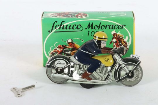 Schuco Modell 0615, "von Stephan", Blech rot/weiß, Replika von 2001, Federwerkaufzug, schwimmfähig, m. 2 Schornsteinen, 2 Flaggen und festen Aufbauten, Schlüssel, L: 28 cm, im OK; kaum Altersspuren, 1 min. Katzer am Unterschiff; 1 x Schuco Motoracer 1006, Postmotorrad, dunkelblau/gelb, Uhrwerkantreib, mit Schlüssel, im OK, unbespielt.