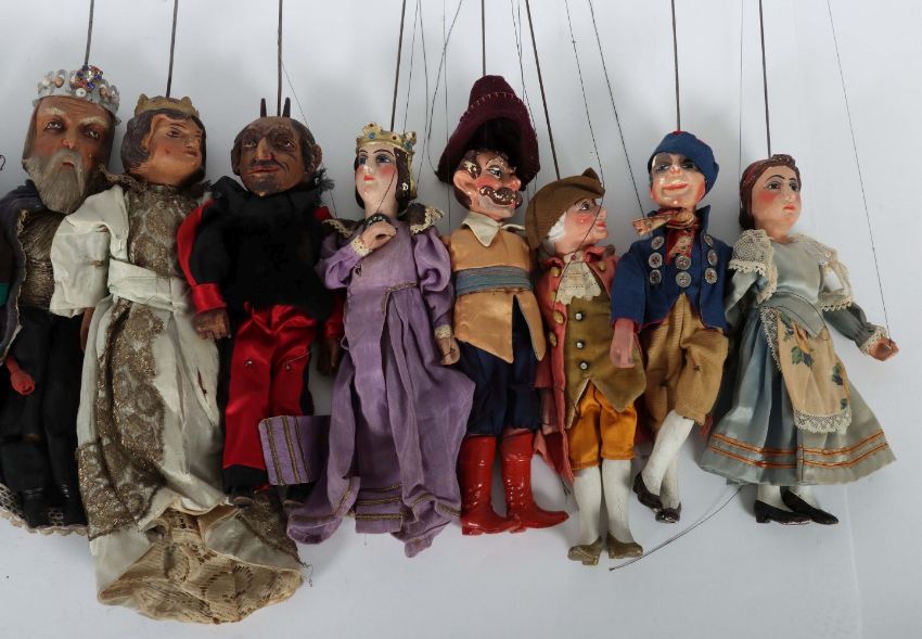 Tschechoslowakei, ca. 1930er Jahre, 9 Figuren Holz geschnitzt, fein bemalt, alte Kleidung, mit Pferd und Krokodil, Teufel, König & Königin, alter Mann, Landsknecht, Feuerwehrmann, Diener, 5 Figuren aus Gips modelliert mit Gipsarmen und Beinen, feine Bamalung in hellen Farben: 1 Könnigen, 1 Edelmann und Frau in Tracht, Kasperl, 1 Musketier, H: ca. 25-30 cm. Part. Alterspuren, Gipsfiguren part. m. Farbabplatzern.