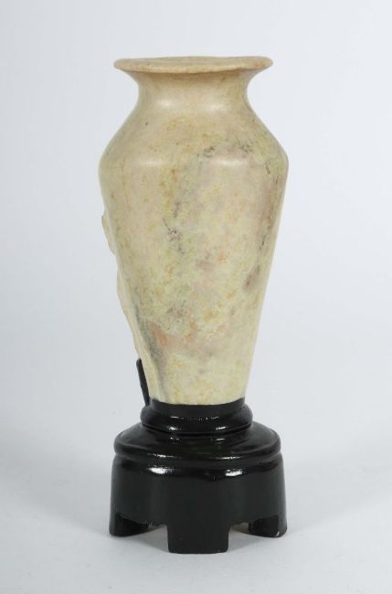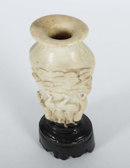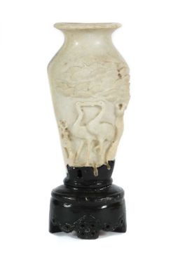 China, 1. Hälfte 20. Jh., geschnitzt mit Sockel aus einem Stück, schauseitig nahezu vollplastisch ausgearbeitetes Relief mit zwei Kranichen unter einer Kiefer stehend, profilierter Sockel mit Durchbruchschnitzerei am Stand, mit Schwarzlack gefasst, H: ca. 25,5 cm.