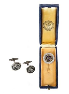 3. Reich, Paar Manschettenknöpfe eines Fliegers, Metall, ovale Form, gegossen mit Lorbeerkranz und m. Adler im Flug; 1x emaillierte Nadel, VdI: Verein dt. Ingenieure, im Etui. Manschettenknöpfe m. Altersspuren.
