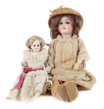 Deutschland, um 1920, 1 x Porzellan-Brustblattkopf, ohne Marke, braune Glasaugen, offener Mund m. vielen Zähnen, feine Bemalung, Perücke, Lederkörper mit Gelenkzwickeln, Stoffbeinen und Porzellanhänden, altes Spitzenkleid m. Unterkleidung, H: 40 cm; 1 x Porzellan-Kurbelkopf, Halsmarke Quenn Louise, Germany, Pappdeckel und Perücke lose, Holz/Masse-Gliederkörper mit externen Kugelgelenken, modellierte Kniee, altes Kleid m. Unterkleidung, H: 60 cm, part. Altersspuren, kl. Puppe m. min. rest. Chip am Mund., gr. Puppe wohl Hände ergänzt.