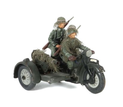 Lineol, Masse, bemalt, Rad mit Fahrer und Beifahrer, je mit Gewehr und Tarnung, Beiwagen mit MG, seltene Ausführung mit grauen Reifen, H: 7,5 cm-Serie. Guter Zustand, geringe Altersspuren, unbespielt.