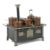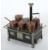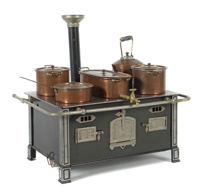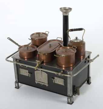um 1920, geschwärtzes Gehäuse, Beine über Eck mit ausgestellten Fußteil und Rechteckdekoration, 3 geprägte Weißblechtüren, 2 Luftabzüge, Platte mit 5 Kochstellen, gemarkt: D.R.G.M., gesteckter Schlot mit Weißblechabschluß, 2 Töpfe mit Deckeln, 1 Stielpfanne mit Deckel, 1 Wasserschiff mit Ausguss und Deckel, 1 Kanne mit erg. Deckel, Weißblech verkupfert, umlaufende Galeriestange, gesteckter 2-flammiger Brenner, BxTxH: 36/29/35,5 cm (mit Schlot). Part. Altersspuren, 1 Deckel fehlend, Kanne mit Dellen, wohl erg..