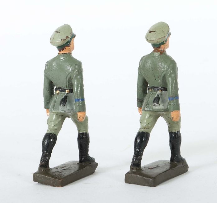 Lineol, Masse, bemalt, in Uniform des Stahlhelmbundes je mit Gauabzeichen und blauem Band am rechten Arm, H: 7,5 cm-Serie. Für diese seltenen Figuren guter Zustand, unbespielt, wenig rissig, 1x Halsriss, Kopf fest.