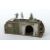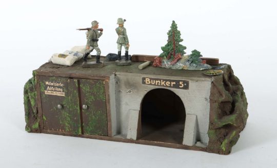 Hausser, Holzverschlag mit rundem Tor, darüber "Bunker 5", eine Doppeltüre daran ein Plakat: "Motorisierten Ableitung-Rauchen verboten", umgeben von Landschaftsmodellierung, anbei 2 Masse-Soldaten mit Gewehr und mit Feldstecher, Grundplatte mit Stempel: 648/1, LxB: 38/17 cm. Zubehör: 1 Tanne aus Masse, 1 Holzbalken, 3 Lagersäcke, 1 Heugabel, 2 Drahtrollen, 1 Metallrad, 1 Granate. Guter Zustand, kaum Altersspuren, selten.