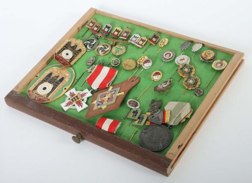 insgesamt ca. 43 Stück, davon 8 Nadeln und 2 Plaketten, deutscher Schützenbund, weitere Schützenabzeichen, Sportbund und andere, verschiedene Zeiten, meist emailliert. Teils leichte Altersspuren.