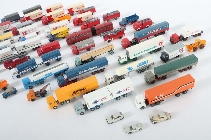 Wiking, M 1:87, mit 8 PKW's (mit 2x Praline, 1x Brekina), 2 Krankentransporter, 3 Busse, 8 Feuerwehr-Fahrzeugen, 6 Baufahrzeugen; 11 Auflieger-Fahrzeuge, 7 LKW's mit Anhänger und 9 LKW's je mit Werbung. Unbespielt, kl. Fehlstücke evtl. möglich.