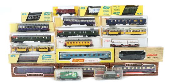 Liliput, Spur H0, 1 x Dampflok mit Tender "SantaFe" 15 002; 2 x Straßenbahn 19300 und 19400; 3 x Reingoldwagen: 1 x Gepäck 82100, 2 x Salonwagen m. Küche 82400; 2 x Personenwagen 298 02; 1 x Personenwagen 287; 1 x Gepäckwagen 289; 1 x Nostalgiewagen 279 53; 1 x Speisewagen 261 00; 1 x Schlafwagen 265; 1 x Niederflurwagen "Smart" 200 L; 1 x BP-Schienenputzer 252 03; 1 x Güterzugbegeleitwagen 245; 1 x Hochbordwagen 244?; 1 x Personenwagen der ÖBB 288; dazu 3 Güterwagen: 207, 215 und Postwagen; je in OVP; unbespielt und wenig bespielt, part. Alters- und Lagerspuren, Funktion nicht geprüft.