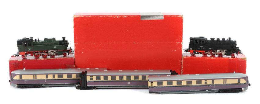Gützold DDR, Schnell triebwagen G 14, DDR, Spur H0, 3-teilig, bez.137 154 a, elfenbein/violett; Dampflok 1831, BR 75, grün/schwarz; Dampflok 08 / G11, BR 64, schwarz; je im OK, unbespielt, nur Testläufe, part. leichte Alterspuren, Karton mit part. Altersspuren, 2 Etiketten m. Fehlstellen, auf Funktion nicht geprüft.