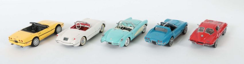 Franklin Mint, M:1:24, 1 x Corvett C3 von 1968, blau, mit 2-teiligen Dach; 1 x Corvette Cabriolet von 1956, türkies/weiß; 1 x Corvette von 1986, gelb; 1 x Corvette "Stung Ray" von 1963, rot; 1 x Corvette Convertible von 1953, weiß, Etikett, im OK der Fa. Fities, made in Japan; je in org. Versandverpackung (beschriftet), unbespielte Vitrinenstücke.