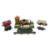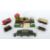 JeP Jouets de Paris, Spur 0, E-Lok, Guss grün, bez:: 1B1 711, L: ca. 25 cm; 1 x Kesselwagen mit 2 roten Fässern, 4-achsig auf 2 Drehschemeln, L: 17,5 cm; 1 x Tankwagen "STEF", L: 18,5 cm; 1 x Wagen mit Kipplore, L: 13 cm; 1 x Plattformwagen mit Drehschemel, : 13,5 cm; unbekannter Hersteller: 1 Schotterwagen mit Spitzdach und Klappdeckeln, L: 15,5 cm; 1 x Bahnübergang mit 2 Schranken und Wärterhaus, LxB: 34/21 cm, Altersspuren, Lackverlust, part. rostig, Fehlstellen.