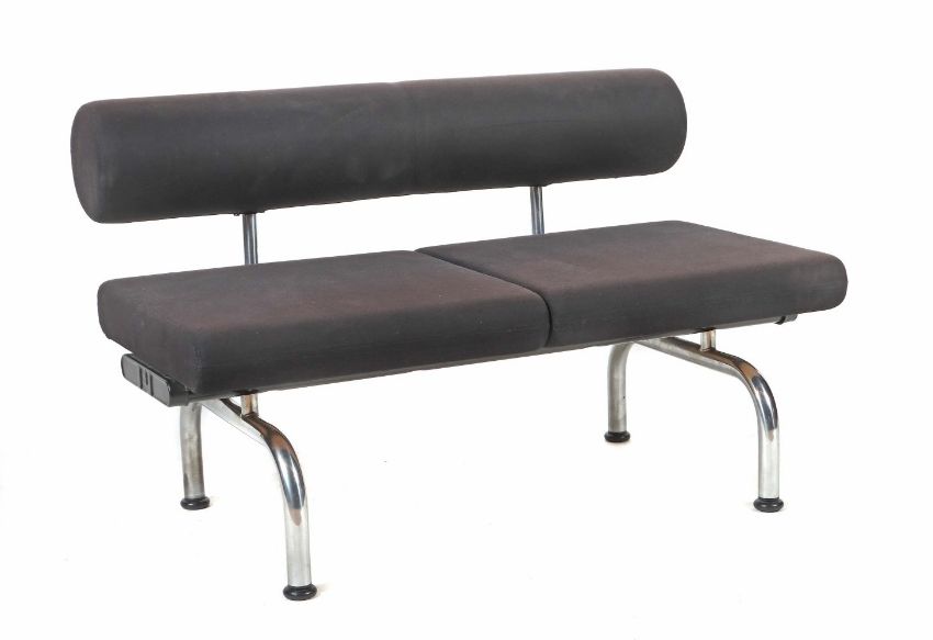 Zweisitzersofa "Pipeline" für Erik Jorgensen Møbelfabrik Svendborg, Dänemark, 1980er Jahre, mit Klebeetikett, modulares System durch Schraubverbindung (Schrauben nicht beiliegend), erweiterbar zu einer Sitzlandschaft, das Gestell aus schwarz lackiertem und verchromtem Stahlrohr auf höhenverstellbaren Kunststofffüßen, die Sitzpolsterung auf Holzplatte, zylindrische Rückenpolster, gewebter Textilbezug in Schwarz, HxBxT: ca. 75/120/73 cm. Alters- und Gebrauchsspuren, Flecken, Rückenlehne tlw. verblichen.