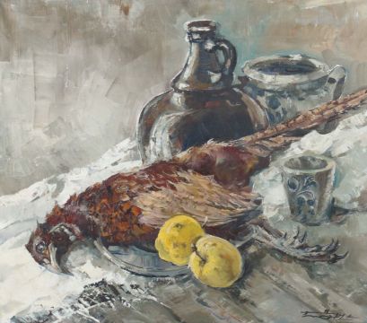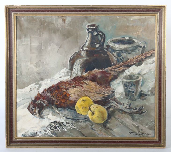 München 1913 - 1986 ebenda, deutscher Maler. "Stillleben mit Fasan", Weinkrügen und Quitten, unten rechts sign., Öl/Leinwand, HxB: 70/80 cm. Mit Rahmen.