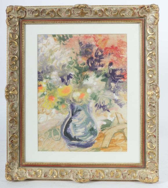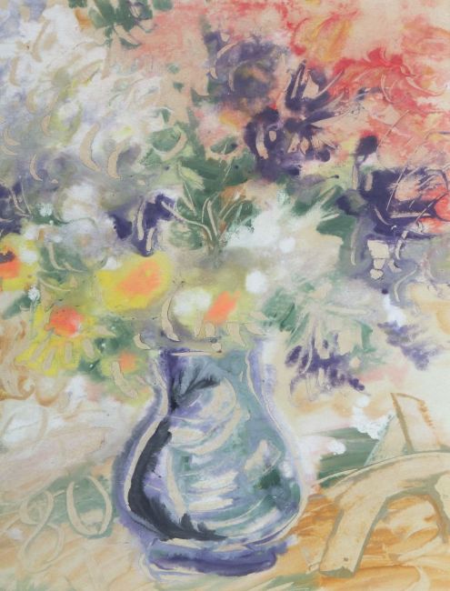 Moskau 1931 - 1986 ebenda, Maler. "Blumenstillleben", sommerlicher Strauß in blauer Vase vor neutralem Grund, unten recht wohl monogr. mit einem großem "A", unten links dat. (19)80, Gouache/Papier, HxB: 50/38 cm (Passepartoutausschnitt). Gebräunt. Im Passepartout hinter Glas gerahmt.
