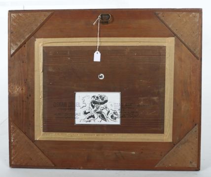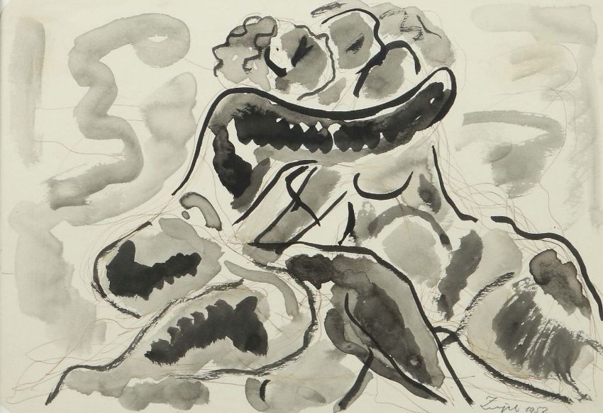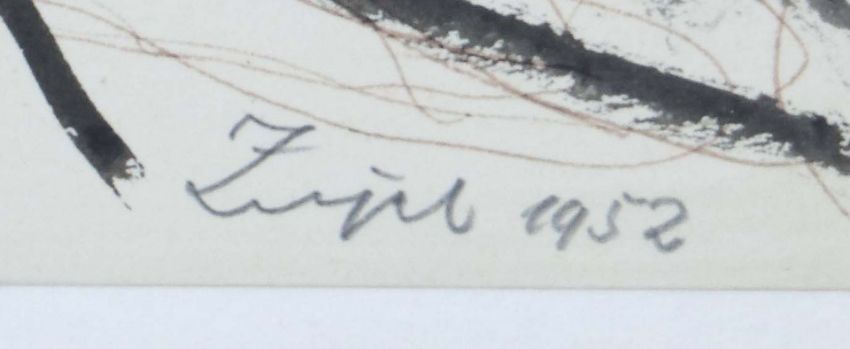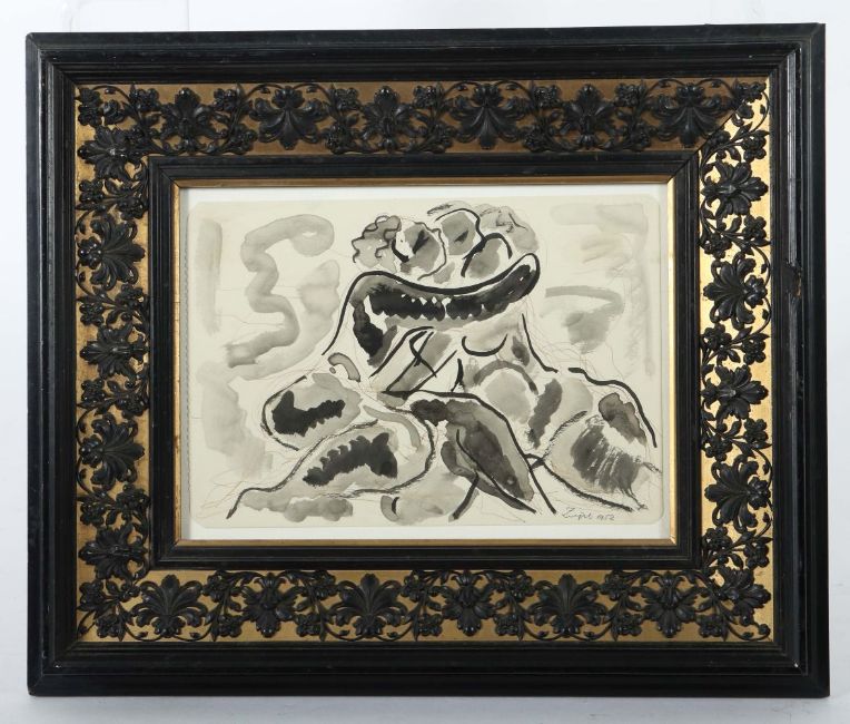 Murrhardt 1892 - 1968 Tosa de Mar, deutscher Maler. "Liebespaar", stilisierte Figurenkomposition, unten rechts sign. und dat., rückseitig bez., Aqarellzeichnung/Papier, HxB: 20/27 cm. Altersspuren, gebräunt. Mit verglastem Rahmen (besch.).