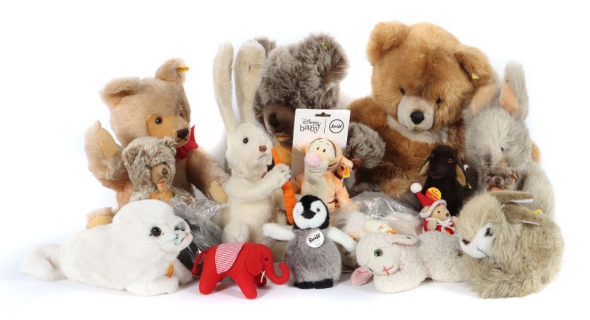 Steiff, meist 1990er/2000er Jahre, 1 x Teddy, Knopf, Fahne: 0201/51, Teddy Knopf, Fahne: 0320/65, Zotty, Knopf, Fahne: 0302/50, Zotty ohne K/F, H: 23 cm, Zotty, Knopf, Fahne: 029950, 2 x liegendes Lamm: 1 x in org. Folie, Knopf, Fahne, Etiketten, 1 x ca. 1970er Jahre m. Knopf, L: ca. 22 cm; 3 x Hasen: 1 x sitzend mit Knopf und Fahne: 2956/18, 1 x m. Möhre, Knopf, Fahne: 037078, Etikett; 1 x weichgestopft, Knopf und Fahne: 3135/45; 1 x Cosy Heuler, Kopf, Fahne: 5374/35, Etikett; 1 x Lamm "Dossy", Knopf, Fahne: 073083; 1 x Disney-Bay, Knopf, Fahne: 290084, Etiketten; 1 x Elefant, Knopf, Fahne: 035814, Etikett; 1x Weihnachtsteddy, mit Etikett, H: 10 cm; 1 x Maulwurf in org. Folie, Knopf, Fahne: 056789, Etikett; 1 x Pinguin, Knopf, Fahne: 057144, Etikett. teils unbespielt, neuwertig, teils leichte Altersspuren.