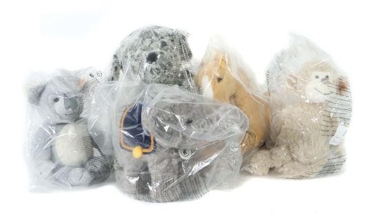 Steiff, neuzeitlich, 1 x Koala "Nils", Nr. 067587, H: 30 cm; 1 x Schlenker Haflinger "Franzi", Nr. 070679, L: 30 cm; 1 x Hund "Taffy", Nr. 083655, H: 45 cm; 1 x Affe "Bingo", Nr. 060298, H: 30 cm; 1 x Elefant, stehend, Nr. 031083, H: 22 cm; je in org. Folie verschweißt, unbespielt, neuwertig.